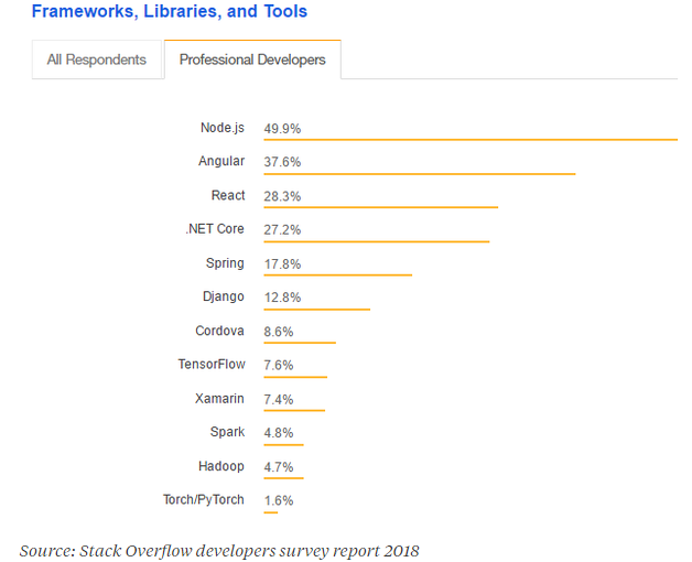 La demanda actual de JS o Node.js (En el lado del servidor) representa una de las tecnologías con más relevancia para el ecosistema del desarrollo web según datos del Stack Overflow Overflow developers survey report 2018